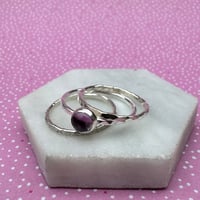 A sterling silver stacking ring, hand crafted with a hammered texture sterling silver band and topped with a 6mm amethyst, hand set in sterling silver.